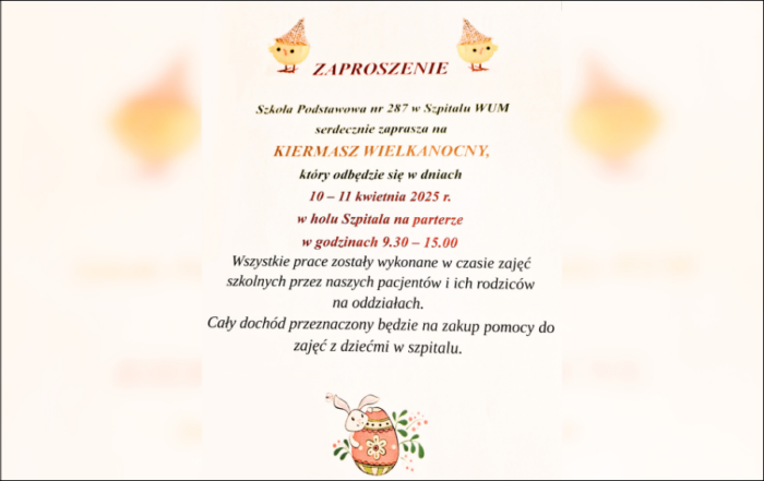 Uczniowie i Nauczyciele działającej w Dziecięcym Szpitalu Klinicznym UCK WUM Szkoły Podstawowej nr 287 zapraszają na doroczny Kiermasz Wielkanocny, który [...]
