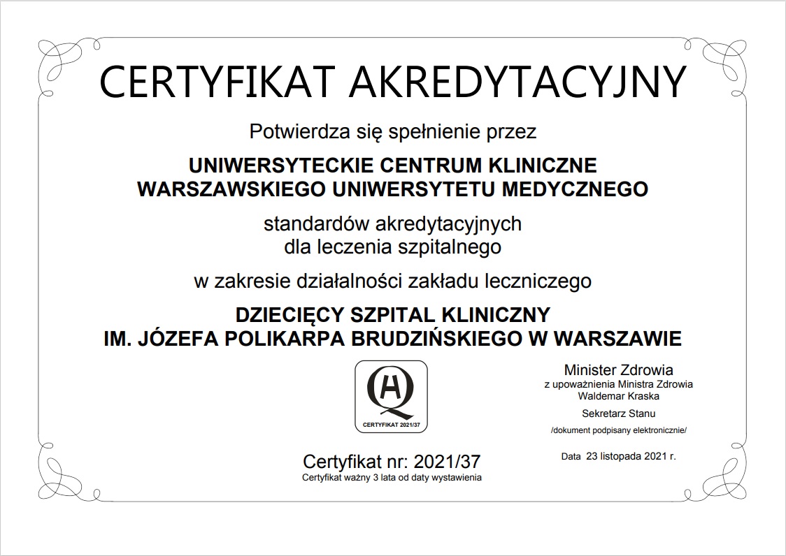 Certyfikat akredytacyjny dla Dziecięcego Szpitala Klinicznego im. Józefa Polikarpa Brudzińskiego UCK WUM