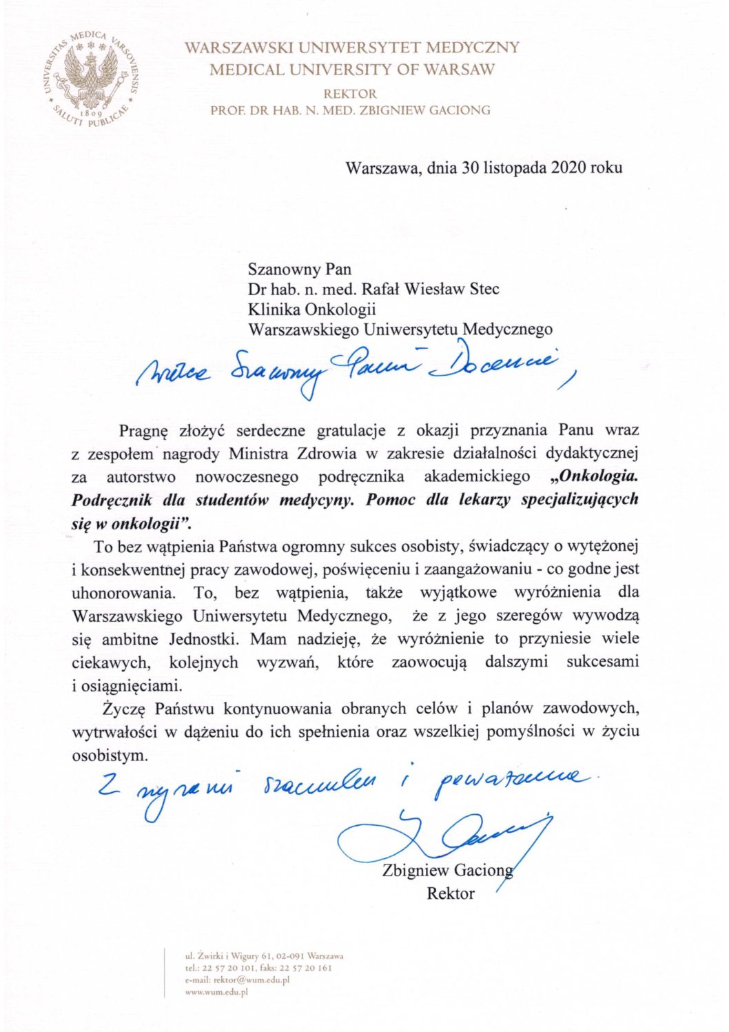 Prezes Polskiej Akademii Nauk, prof. Jerzy Duszyński, nagrodził prof. dr hab. n. med. Grzegorza Opolskiego - kierownika Kliniki Kardiologii Centralnego Szpitala Klinicznego UCK WUM za wybitne osiągnięcia naukowe w 2020 roku. Prof. Grzegorz Opolski, członek korespondent PAN, zastępca przewodniczącego Rady Kuratorów Wydziału V Nauk Medycznych, otrzymał nagrodę za badania dotyczące chorób serca w szczególności wyrównanej [...]