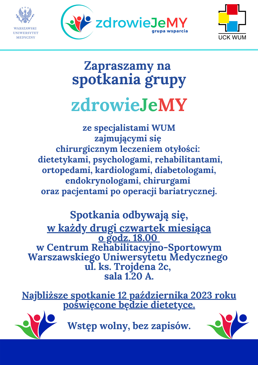 Spotkania grupy ZdrowieJeMY ze specjalistami Warszawskiego Uniwersytetu Medycznego i Uniwersyteckiego Centrum Klinicznego WUM zajmującymi się chirurgicznym leczeniem otyłości: dietetykami, psychologami, rehabilitantami, ortopedami, kardiologami, diabetologami, endokrynologami, chirurgami oraz pacjentami po operacji bariatrycznej odbywają się w każdy drugi czwartek miesiąca o godz. 18.00 w Centrum Rehabilitacyjno-Sportowym Warszawskiego Uniwersytetu Medycznego ul. ks. Trojdena 2c, sala 1.20 A. Udział w spotkaniach grupy jest bezpłatny i nie wymaga wcześniejszych zapisów.